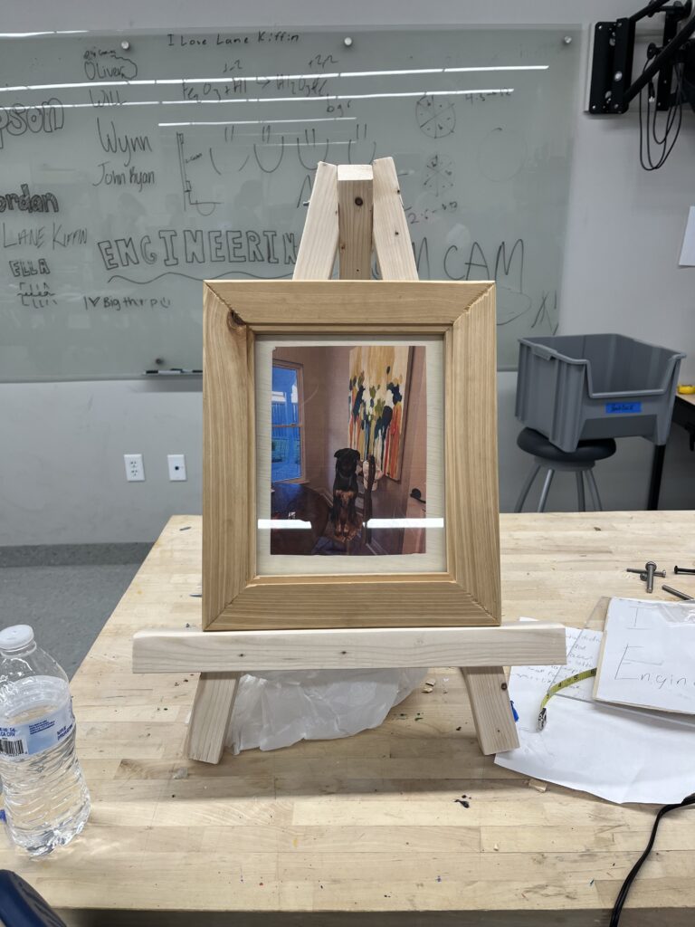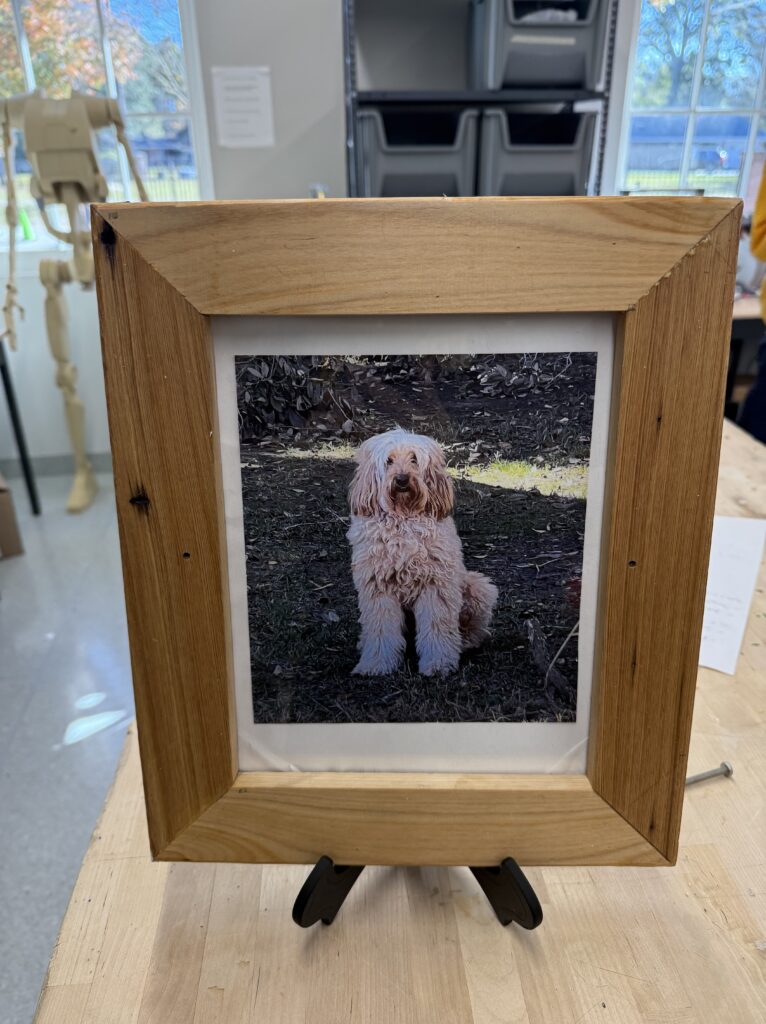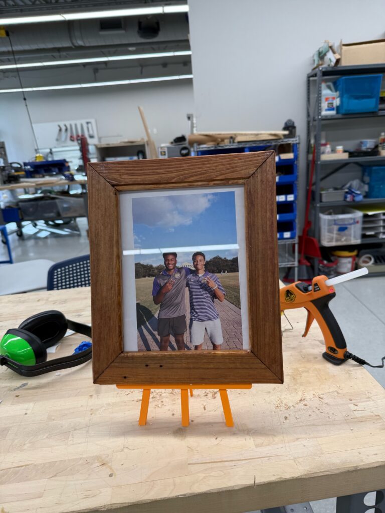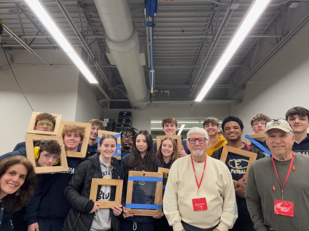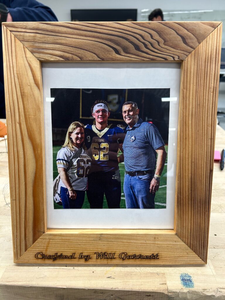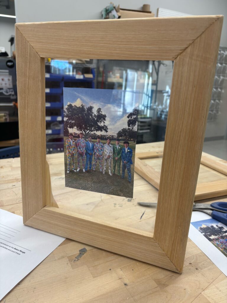 In the fall of 2025 club members Harold Choate and George Campagna worked with the students at Episcopal High in learning how to make picture frames with cypress wood donated by Jean Zarangue and milled with a jointer donated by Art Miller. The students used a set frame size but were allowed to add accessories and come up with what they wanted in the picture. Below is the class, club members and teacher.
