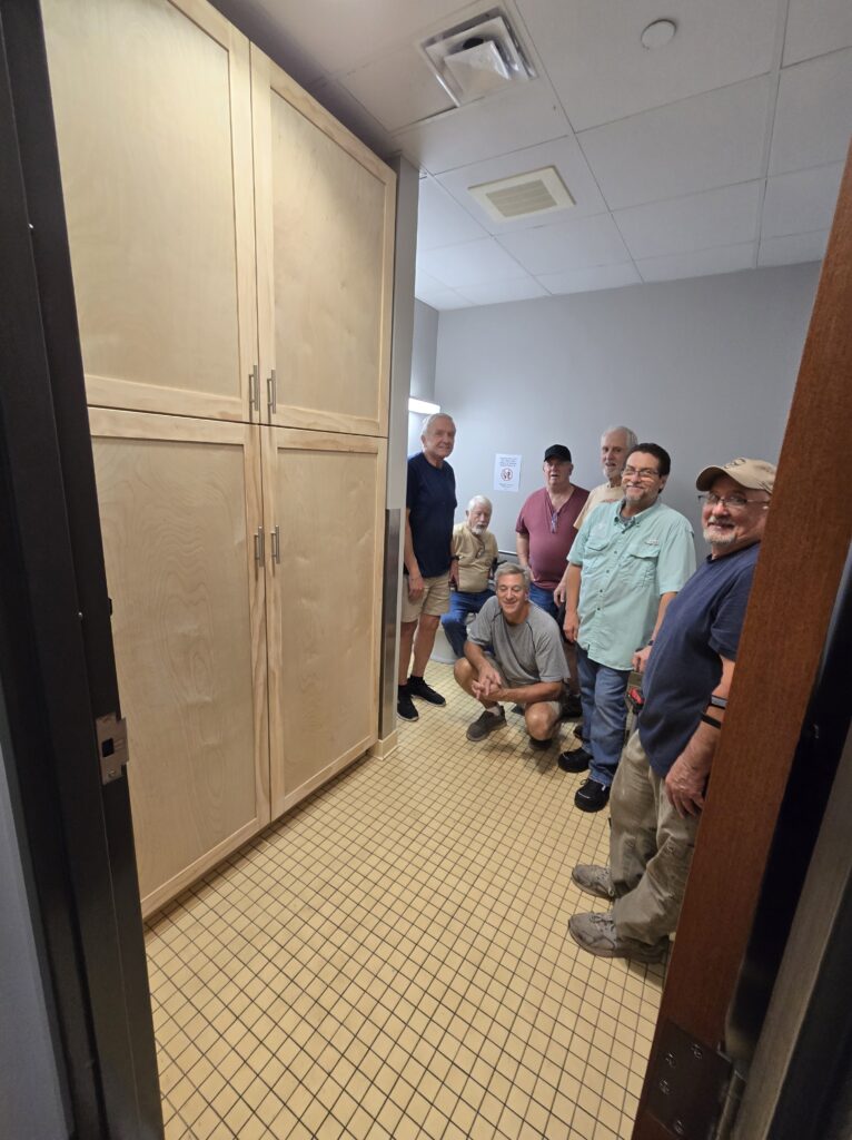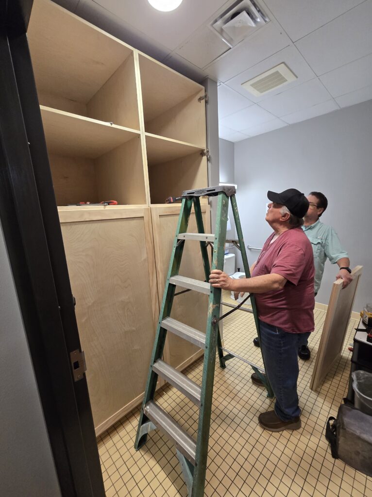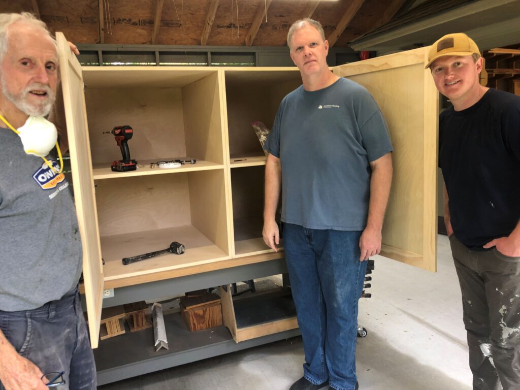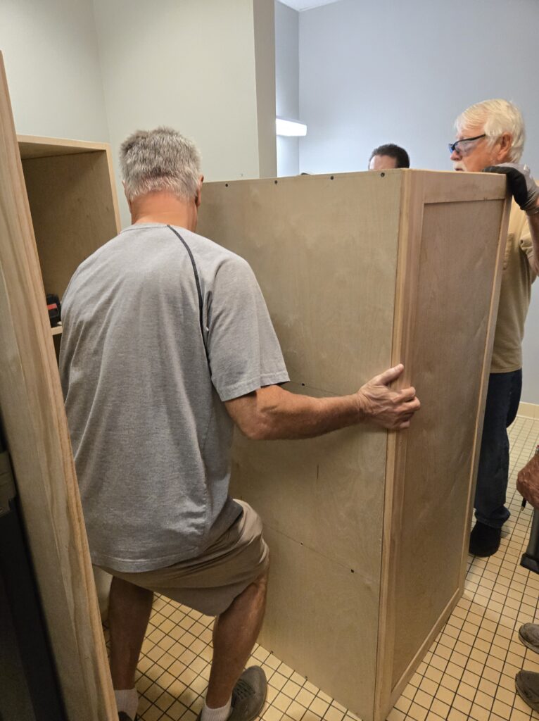 Twelve of our club members worked on this portion of the project in both building and installing the for the VOA shelter. The VOA offers support services for the homeless in our area. This portion is part one of two to make and install cabinets for the bathroom and later the laundry room. After we install the cabinets, VOA will paint them.