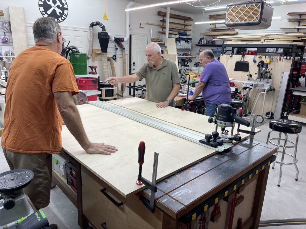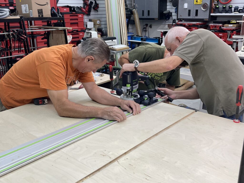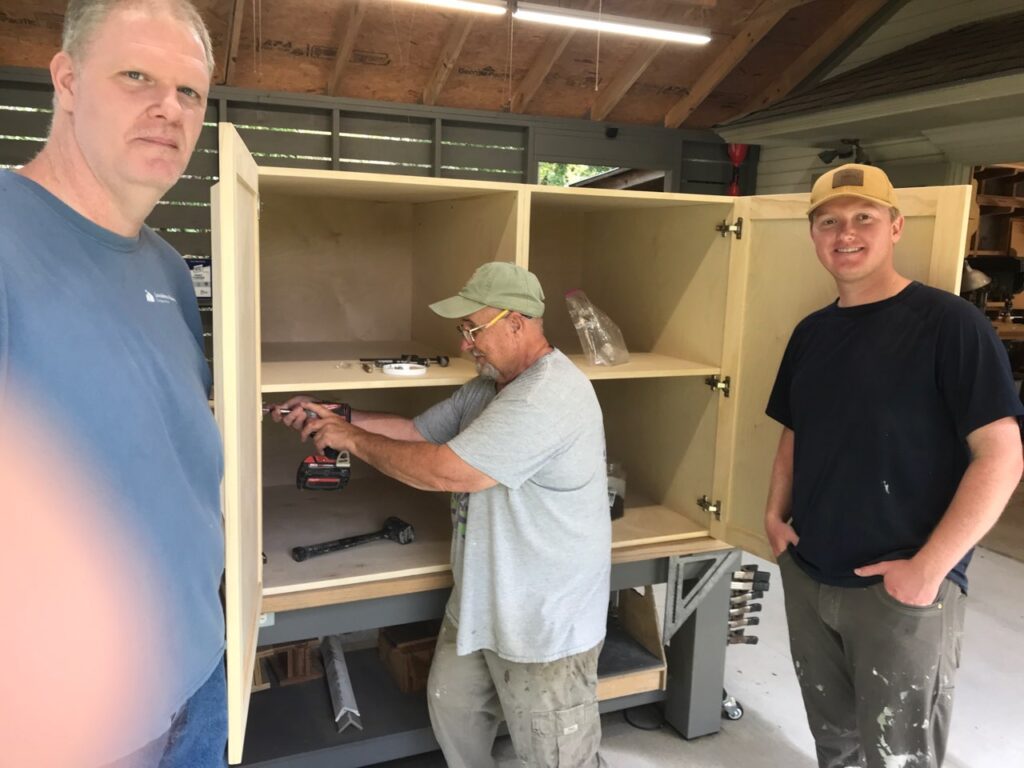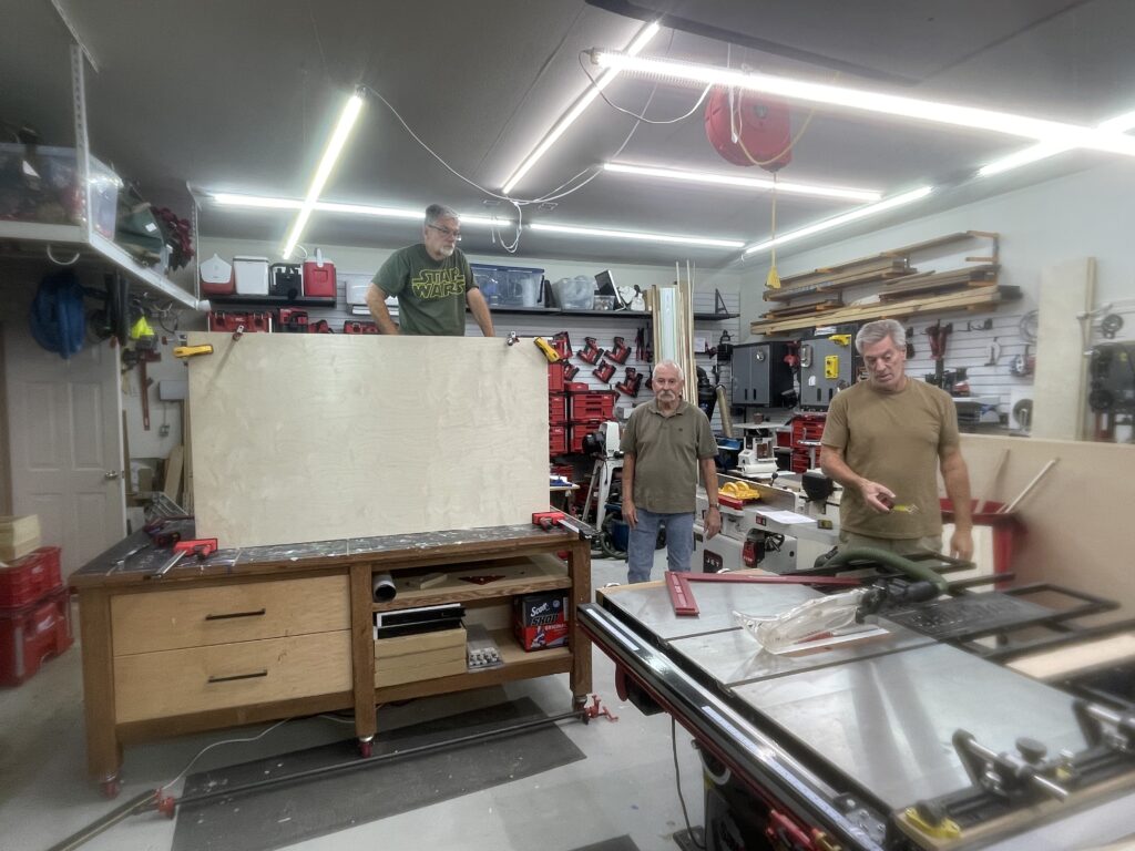 Twelve of our club members worked on this portion of the project in both building and installing the for the VOA shelter. The VOA offers support services for the homeless in our area. This portion is part one of two to make and install cabinets for the bathroom and later the laundry room. After we install the cabinets, VOA will paint them.